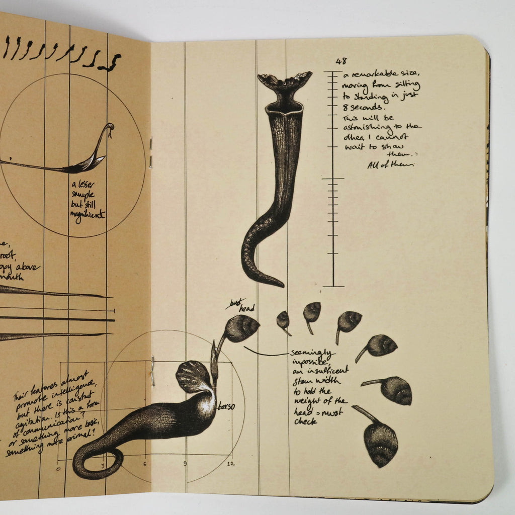 This fictional Victorian Journal presents the absurd ramblings of scientist Professor Wraithchild, lavishly illustrated with engravings by his dubious assistant Gideon Veneer. Wraithchild’s frantic experiments with a mysterious plant species, in part an attempt to re-establish his tarnished reputation, go awry to great comic effect. Clues hidden within the visuals slowly betray an intriguing subtext. A work in the nonsense illustration genre, The Devil’s Noose is the creation of Heidi Ball.