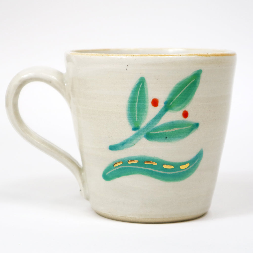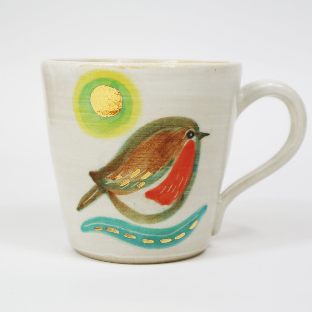 A lovely hand made and hand painted mug. The mug is finished with special details of gold lustre.