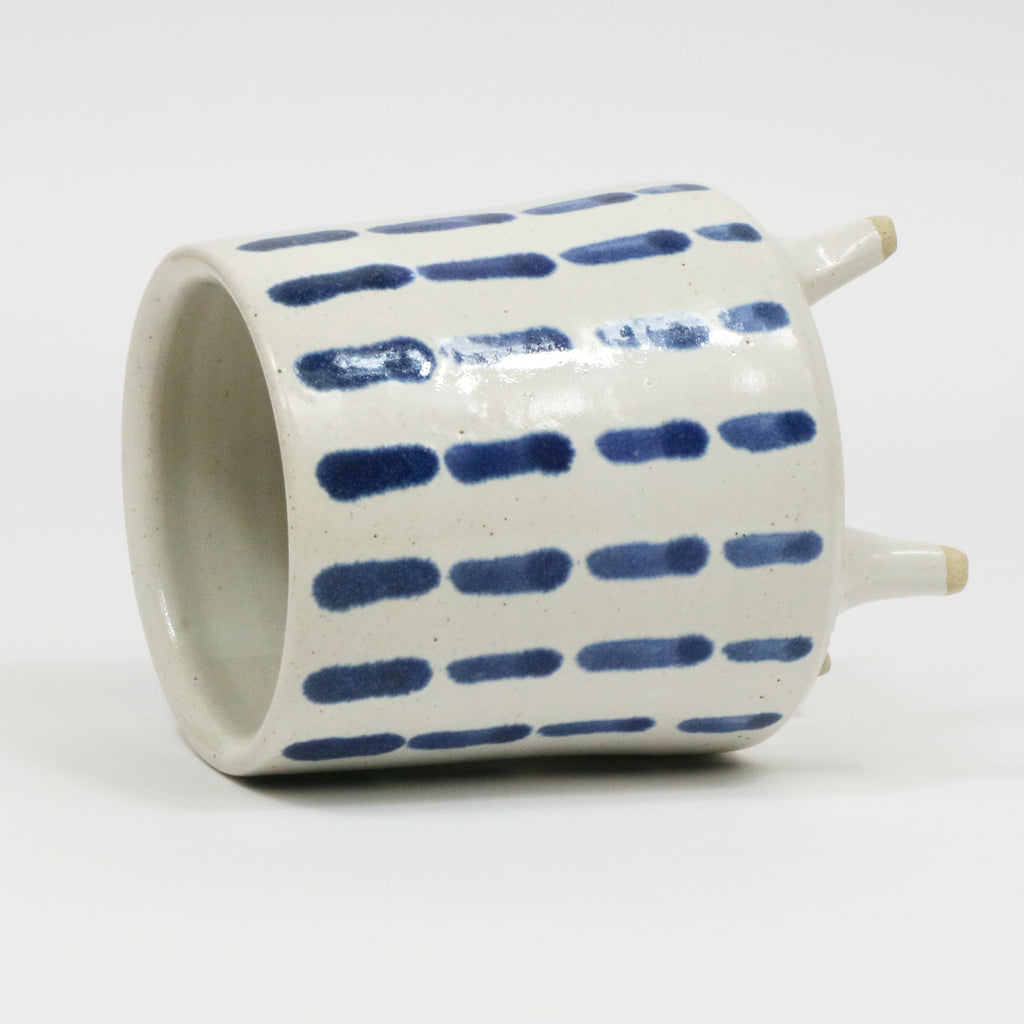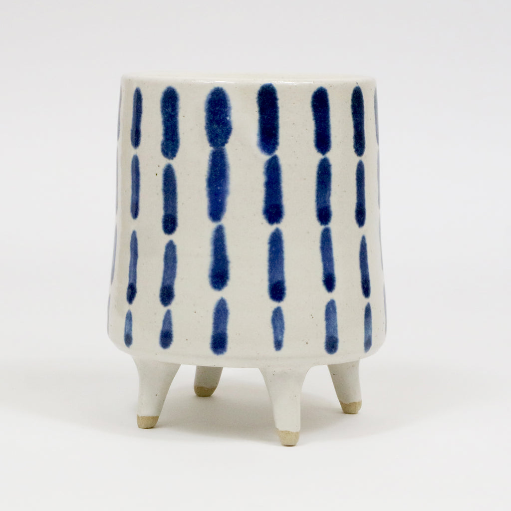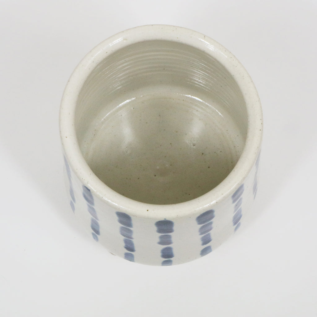 Decorated with an opaque white glaze and indigo dash design. Perfect to use as a desk tidy or for plants!