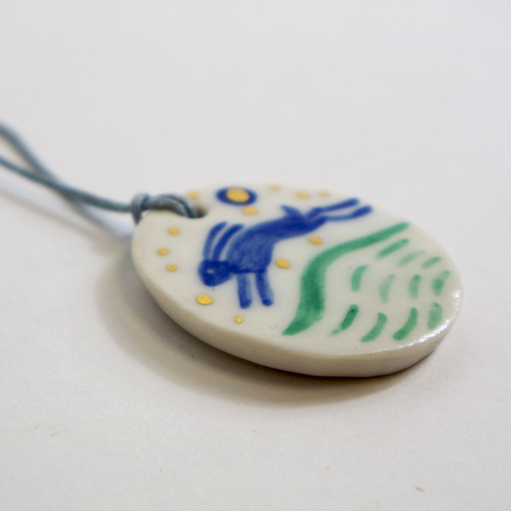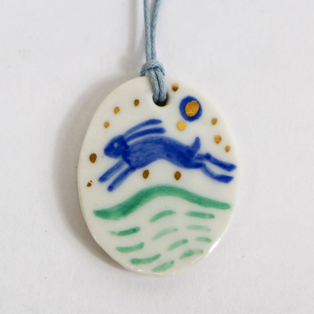 A lovely hand made and hand painted pendant depicting a running hare. The pendant is finished with special details of gold lustre.