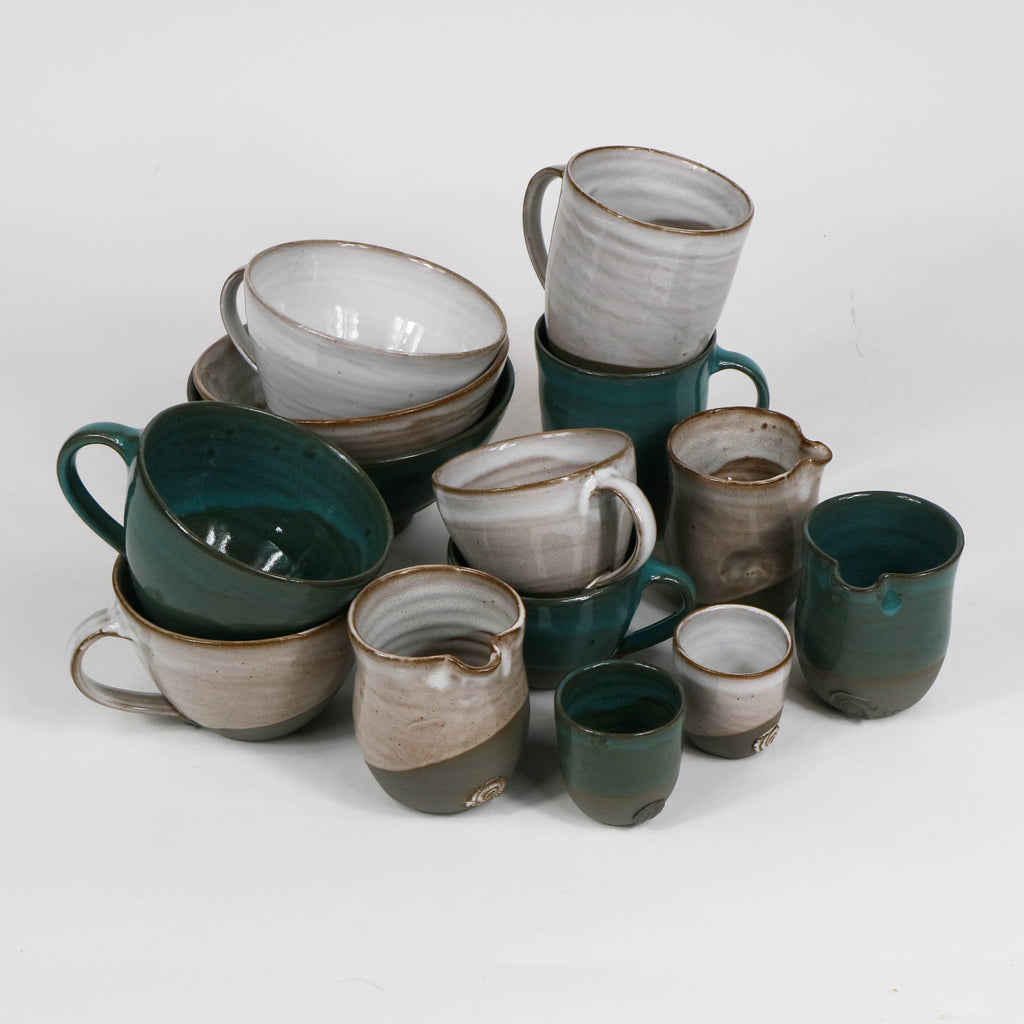 These eggcups come in two colours, white and turquoise. Both feature our signature shell design, reflecting The Poly's logo, and are stamped with 'PP'. Made using our signature grey clay, these stoneware eggcups are ovenproof and suitable for dishwasher and microwave use.