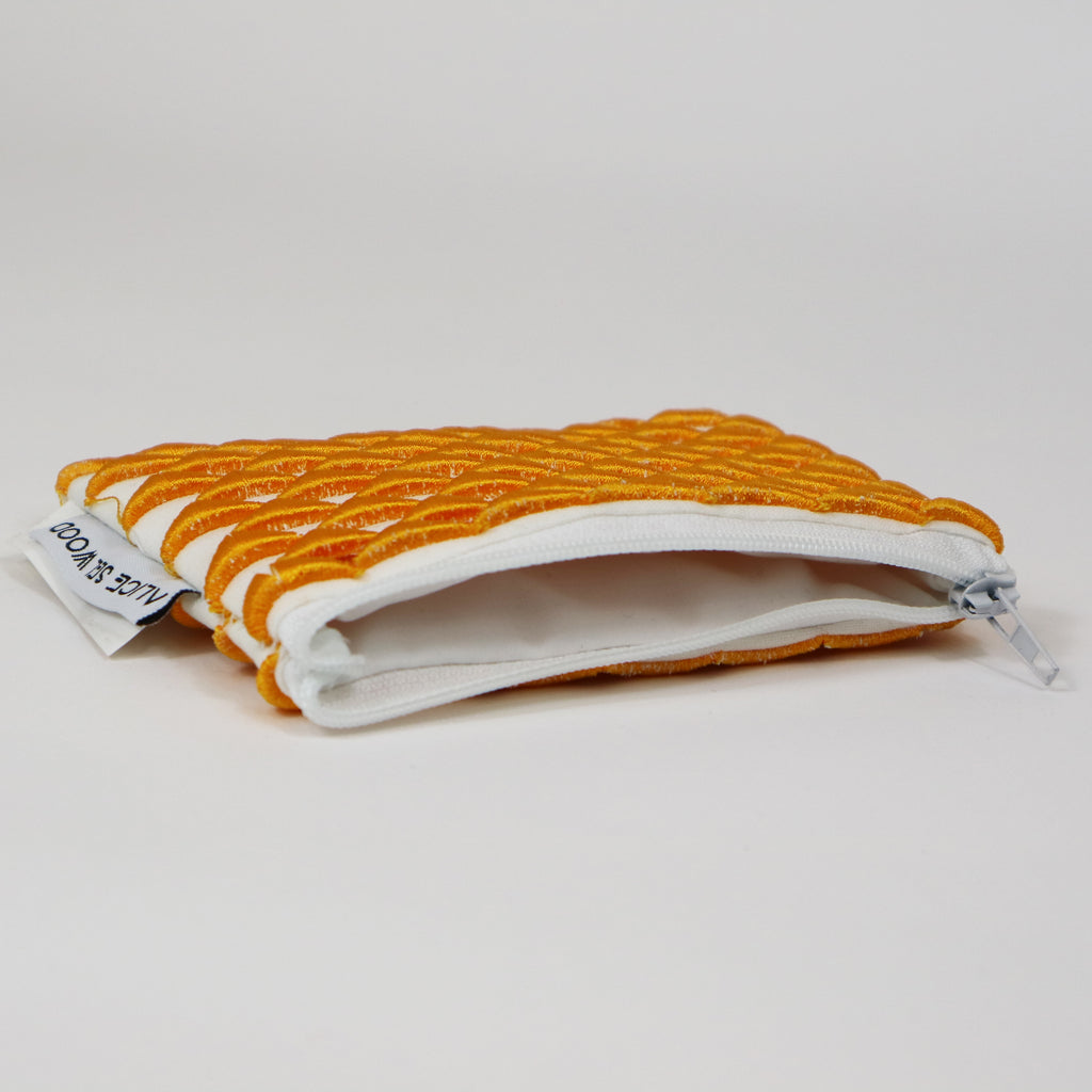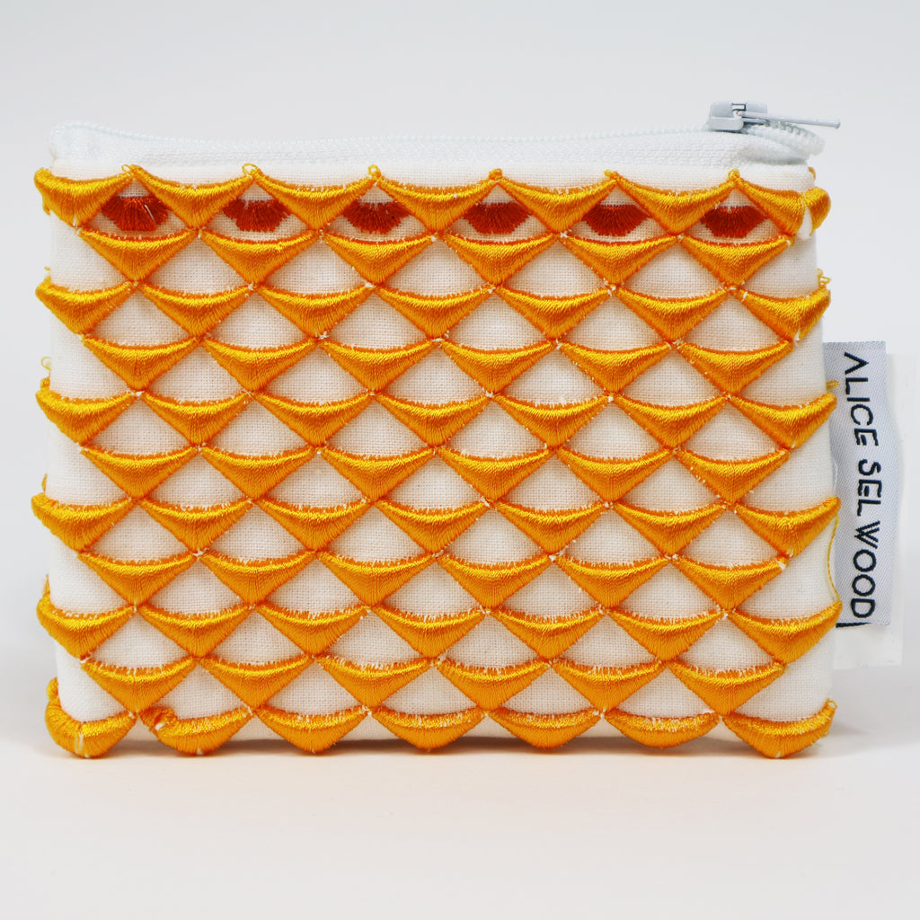 The Kynance Coin Purse in orange is a beautiful cotton bag, digitally embroidered with multi-layer stitching to give a unique and highly textural surface pattern. Lined with a white, stiff, poly-cotton fabric making the bag durable and strong enough to hold its own shape.